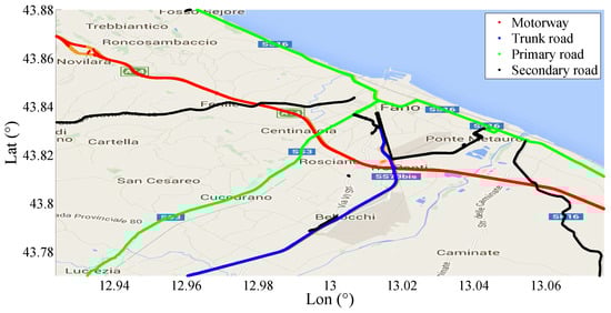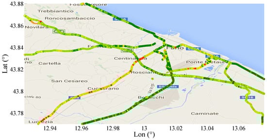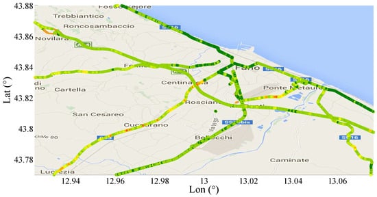 In Figure 18, a section of Central–East Italy is shown with highlighted the roads covered by the SmartRoadSense projects. Each type of road has been represented by means of a different color as described in the figure legend. The typical roughness index calculated by SmartRoadSense over the map of Figure 18 is represented in Figure 19 and the new values, obtained after the application of (16), are plotted on Figure 20. In both plots, the color maps have ten ranges determined with a statistical criterion following a geometric distribution. Specifically, the data of the entire database has been ordered according to the magnitude of the roughness index value. The 50% of data having the lowest value has been marked in dark green, the following 25% data has been marked in a light green, the following % of data has been marked with an even lighter green, ..., the % of data having the largest value has been marked in red.