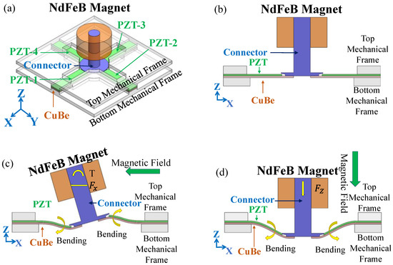 The design of the sensor is shown in Figure 1a. The sensor is comprised of four piezoelectric lead-zirconate-titanate/copper-beryllium (PZT/CuBe)-layered cantilever beams, a neodymium iron boron (NdFeB) magnet, a connector, and top and bottom mechanical frames. The free end of the CuBe sheet of each PZT/CuBe beam is connected by the connector. The fixed end of each PZT/CuBe beam is clamped by the top and bottom mechanical frames. The four beams are connected as a cross-linked-beam. Finally, the NdFeB magnet is fixed on the surface, at the center of the cross-linked-beam. The magnetic sensing principle of the sensor is shown in Figure 1b,d. In Figure 1b,d, the sensor is under an initial/static state (i.e., zero magnetic field and zero ambient vibrations), an x-axis (in-plane) magnetic field, and a z-axis (out-of-plane) magnetic field, respectively. When the x-axial (or y-axial) magnetic field is applied to the sensor, as shown in Figure 1c, the NdFeB magnet (magnetization direction is along the z-axis) experiences a magnetic force (Fx (or Fy)) and torque (T). The magnetic force and torque rotate the NdFeB magnet and, therefore, deform the two x-axis (or y-axis) cantilever beams. Because of the piezoelectric effect, the deformed beams produce voltage outputs. Thus, the sensor achieves x-axis (or y-axis) magnetic-field sensing. When the z-axial magnetic field is applied to the sensor, as shown in Figure 1d, the NdFeB magnet is subjected to a magnetic force (Fz) and, thus, is projected along the z-axis; the z-axial projection deflects the beams. Due to the piezoelectric effect, the deformed beams produce voltage outputs. Therefore, the sensor achieves z-axis magnetic-field sensing.