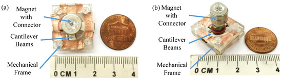 The fabrication of the sensor comprises three parts: (I) mechanical frames; (II) PZT/CuBe layered cantilever beams; and (III) a connector with a NdFeB magnet. First, acrylic plates were machined to serve as the top and bottom mechanical frames. Second, a PZT-5H sheet (length × width × thickness: 7.5 mm × 4 mm × 1 mm) was fixed on a CuBe sheet (length × width × thickness: 9 mm × 4 mm × 0.25 mm) as a PZT/CuBe-layered cantilever beam. Third, the screw, shim, and NdFeB magnet were assembled to serve as a connector with a NdFeB magnet. Finally, the fixed end of each PZT/CuBe beam was clamped by the top and bottom mechanism frames, while the free end of each beam was connected by the connector with the NdFeB magnet. The fabricated sensor is shown in Figure 2. The dimensions of the sensor and its components are summarized in Table 1.