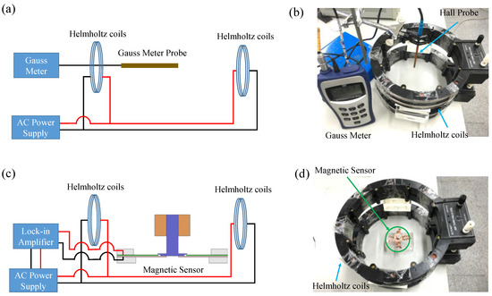 Testing setup of the quantitative test. (a) Illustration and (b) photograph of the Hall probe placed in the central area of the coils. (c) Illustration and (d) photograph of the AC magnetic sensor placed in the central area of the coils.