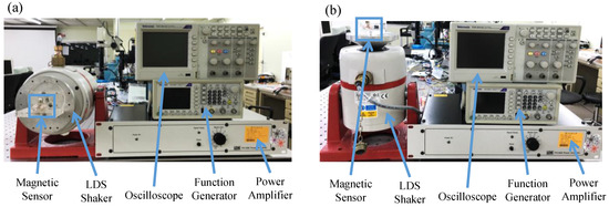 A photograph of the piezoelectric/vibrational energy-harvesting test [27] is shown in Figure 4. A function generator and a power amplifier were used to operate a Ling Dynamic Systems (LDS) shaker with different orientations in order to generate x-axis and z-axis vibrations in the sensor, respectively, as shown in Figure 4a,b. An oscilloscope was used to record the voltage outputs of the sensor.