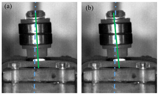 For design validation, the images captured and the movie recorded by, using a high-speed camera, are shown in Figure 5. In Figure 5, by comparing the axial line of the NdFeB magnet (i.e., green line) and the reference line fixed on the background (i.e., blue line), we observe that the NdFeB magnet of the sensor experiences a small angle rotation with a small horizontal displacement. This shows that the x-axis and y-axis piezoelectric beams of the sensor experience slight bending and torsion, respectively (i.e., the sensor design is proven).