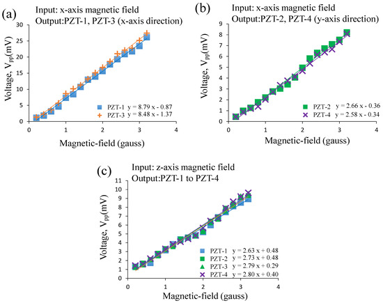 After the resonant frequencies of the sensor were obtained, and we applied the x-axis and z-axis magnetic fields with different magnitudes at the sensor’s resonant frequency to the sensor, respectively. The voltage outputs versus magnetic-field magnitudes are plotted and correlated by curve fitting, as shown in Figure 7. In Figure 7, the voltage outputs have a good linearity with the magnetic-field magnitudes. The voltage outputs with the sensitivities of the PZT-1, PZT-2, PZT-3, and PZT-4 of the sensor under the x-axis magnetic field (sine-wave, 100 Hz, 0.2–3.2 gauss) are 1.13–26.15 mV with 8.79 mV/gauss, 0.43–8.21 mV with 2.66 mV/gauss, 1.33–27.43 mV with 8.48 mV/gauss, and 0.45–8.08 mV with 2.58 mV/gauss, respectively. The voltage outputs of the PZT sheets along the x-axis (PZT-1, PZT-3) are approximately three-times larger than those of the PZT sheets along the y-axis (PZT-2, PZT-4). This is reasonable, as researchers have reported that the piezoelectric output of PZT sheets in the bending mode is larger than the torsion mode [31], and our sensor’s PZT sheets do experience this. Thus, the voltage outputs of the PZT sheets along the x-axis (PZT-1, PZT-3) and the y-axis (PZT-2, PZT-4) can be correlated to indicate the magnitude of the applied x-axis and y-axis magnetic field, respectively. In Figure 7c, the voltage outputs with the sensitivities of PZT-1, PZT-2, PZT-3, and PZT-4 of the sensor under the z-axis magnetic field (sine-wave, 142 Hz, 0.2–3.2 gauss) were 1.31–8.92 mV with 2.63 mV/gauss, 1.33–9.31 mV with 2.73 mV/gauss, 1.22–9.55 mV with 2.79 mV/gauss, and 1.44–9.63 mV with 2.80 mV/gauss, respectively. Because of the geometric symmetry of the cross-linked beams, the voltage output of each PZT sheet is similar. Therefore, the voltage outputs of any of the four PZT sheets can be correlated in order to indicate the magnitude of the applied z-axis magnetic field. Finally, according to these results, our sensor successfully achieves three-axis magnetic field sensing. Furthermore, because the voltage outputs are large and are directly produced by the PZT sheets under different magnetic fields, the sensor is able to perform the energy harvesting function.