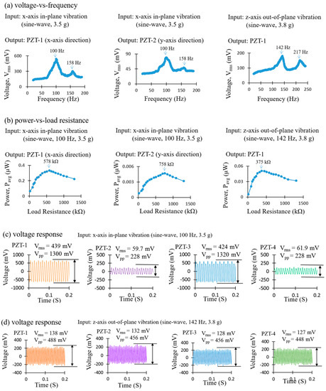 Test results of the piezoelectric/vibrational energy-harvesting function of the AC magnetic sensor: (a) voltage vs. frequency plots and (b) power vs. load resistance plots. The voltage outputs of each piezoelectric lead-zirconate-titanate (PZT) sheet of the sensor under (c) x-axis vibration and (d) z-axis vibration.