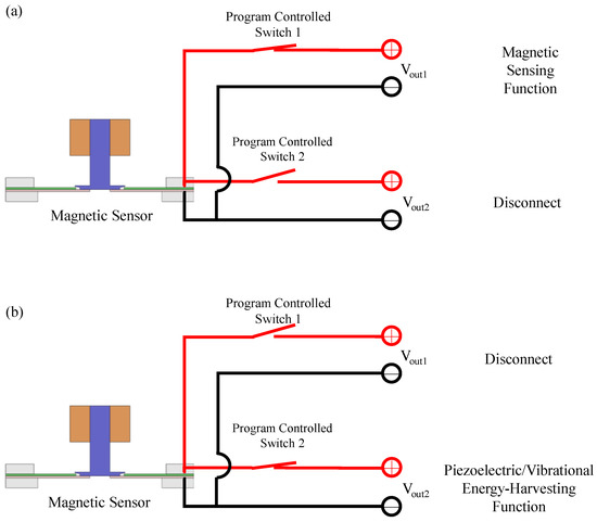 Finally, after the magnetic sensing function and the piezoelectric/vibrational energy-harvesting function of our AC magnetic sensor were performed, we provided guidelines of our sensor for applications. In general, our sensor’s magnetic-sensing function is enabled when using applications that typically require magnetic sensors (for example, vehicle/traffic monitoring, processes monitoring, and security system applications need to use three-axis magnetic sensors). However, the magnetic sensing function can be disabled when the application is turned off. Thus, in this condition, the vibrational energy-harvesting function of the senor can be enabled in order to harness ambient vibrational energy. To switch (i.e., enable or disable) between the magnetic sensing function and the vibration energy-harvesting function, a set of program-controlled switches are used (shown in Figure 9). When turning on the application, program-controlled switch 1 is set to a closed state, and switch 2 is set to an open state, as shown in Figure 9a. Therefore, the sensor enables the magnetic-sensing function and, thus, the voltage output is transmitted to Vout1. When the magnetic-sensing function is disabled, or is in standby mode, program-controlled switch 1 is set to an open state and switch 2 is set to a closed state, as shown in Figure 9b. Therefore, the sensor enables the piezoelectric/vibrational energy-harvesting function, and, thus, the voltage output is transmitted to Vout2. By using the setting protocols, the sensor achieves switching between the magnetic-sensing function and the piezoelectric/vibrational energy-harvesting function. The switching significantly improves the energy utilization of the sensor (note: some researchers may have a concern on a mechanical-coupling/decoupling issue when our sensor utilizes a single mechanical-mechanism to demonstrate two functions. For this issue, please see Supplemental Materials).