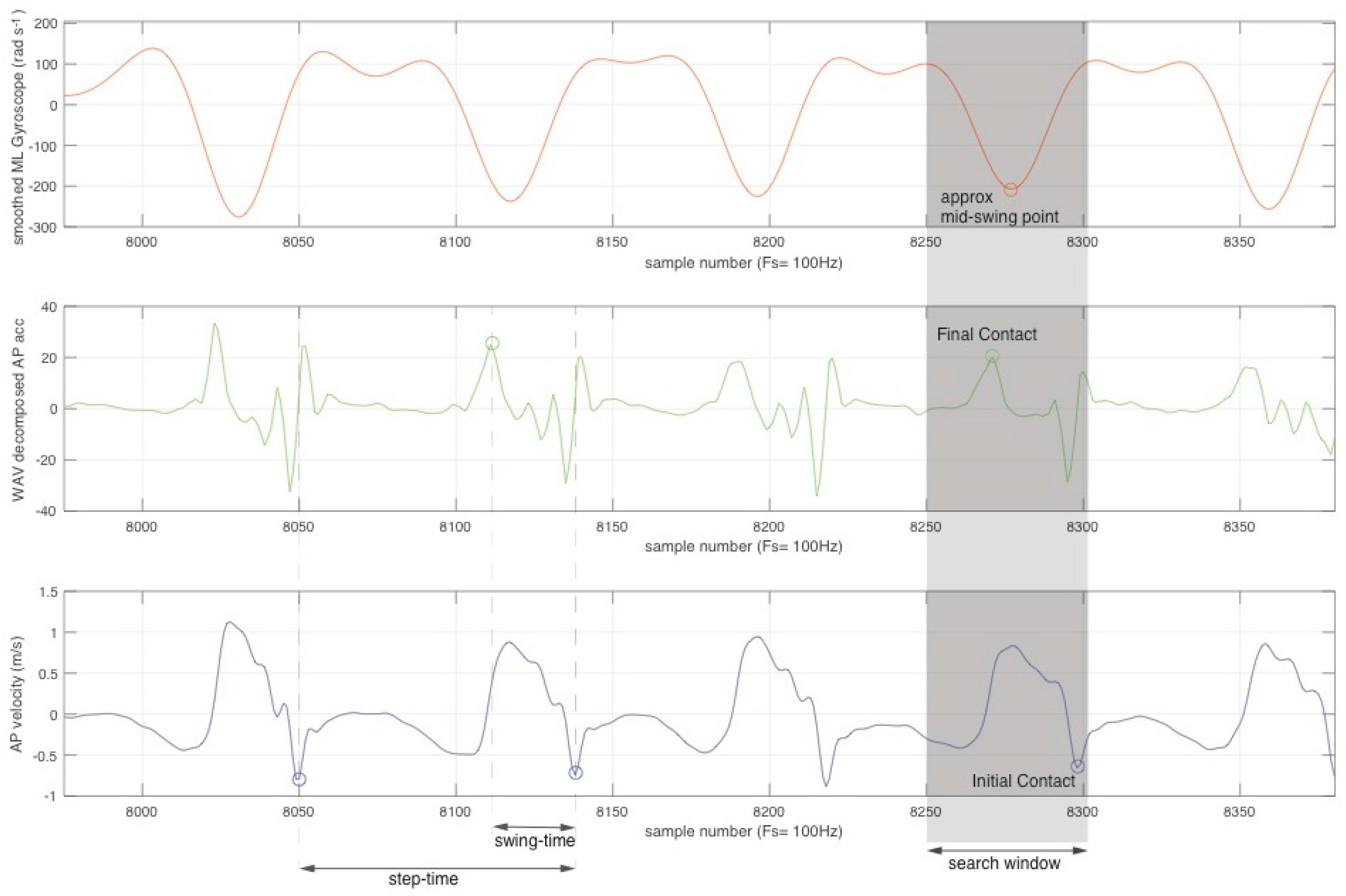 The gyroscope data aligned in the AP axis was smoothed with a 4th order Butterworth filter (fc = 5 Hz). The result of this operation is a roughly sinusoidal signal with troughs around the mid-swing point of each step. A window was placed around each trough and used to highlight possible locations where FC and IC events could occur. The search window width was derived from results reported in Ladha et al. [43]. For FC times, the AP acceleration was decomposed using a 2nd order sym4 wavelet. FC events were detected as high-points, preceding the ML gyroscope trough and within the search window. These points were manually verified using synchronized high-speed video to corresponded to the limb initiating movement from a stationary position (stance) into swing. To determine IC events the AP acceleration was integrated using a Runge-Kutta based approach to yield velocity. To cater for integration drift, the integration was reset for each step; only the signal within the search window was considered. Velocity was subsequently smoothed IC events; found as low-points preceding both the paired FC event and the ML gyroscope trough within the search window. A diagrammatic representation of the event detection process is shown in Figure 4 with example signal traces.