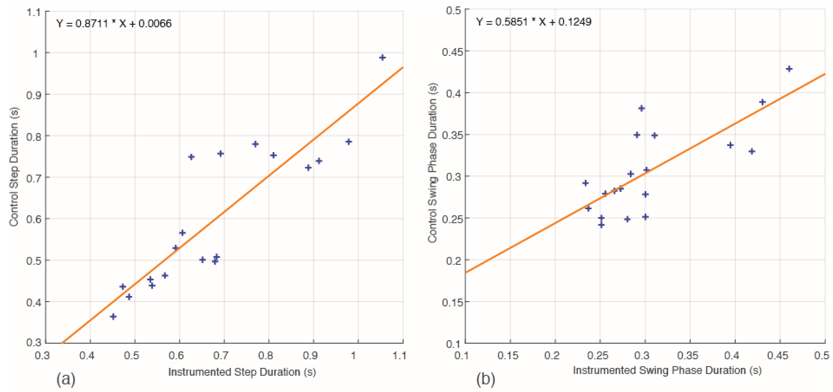 Figure 7. (a) Pearson’s correlation between Control and Instrumented step duration (r = 0.88); (b) Pearson’s correlation between Control and Instrumented swing duration (r = 0.76).