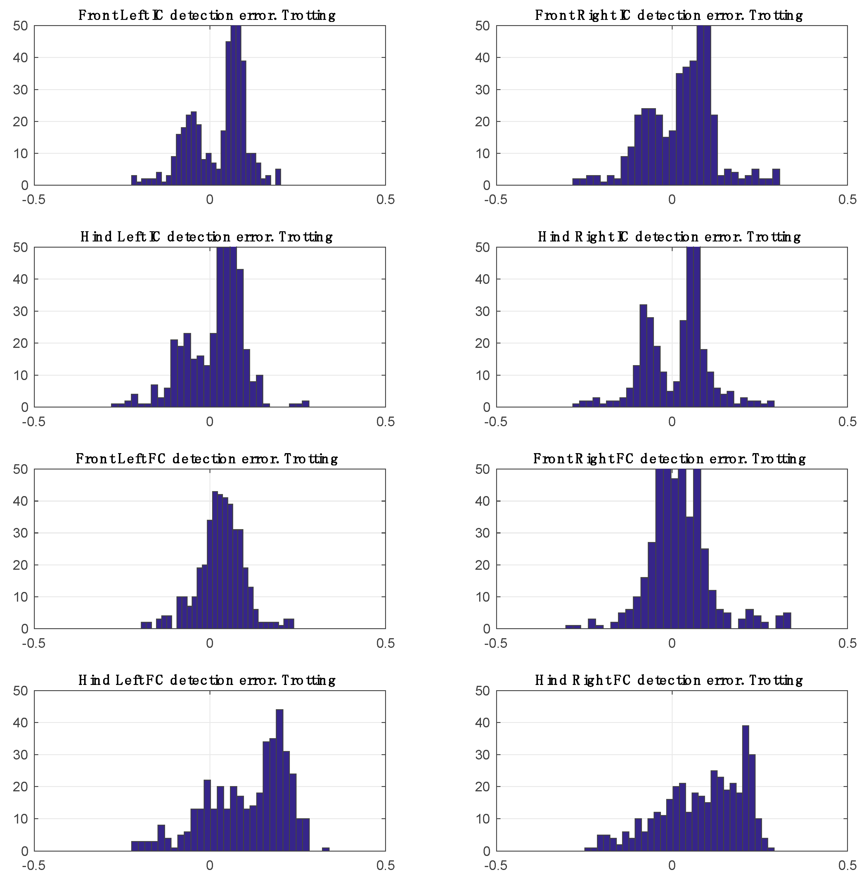 The total number of steps used for performance evaluation was 5041 (FL = 1312, FR = 1310, HR = 1217, HL = 1202). Mean errors for FC and IC detection are listed in Table 1 and distribution of disagreement between annotations and predictions are shown graphically for walking and trotting in Figure 9 and Figure 10.