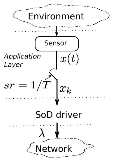 - In contrast to the original sampling rate , we use the term transmission-rate or throughput λ (in packets per second) to define the amount of messages in a time unit that will be sent after the SoD strategy is applied by the SoD driver. Therefore, if there is not a SoD strategy implemented, the transmission and the sampling rates are equivalent ().
