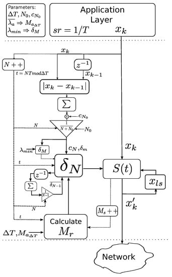 The sampling rate at the application layer is known and the normalized available mean transmission rate is given as the desired final result. Conversely, and, consequently, changes in an unpredictable way and so happens with that may not follow at all. Therefore, should be calculated dynamically to achieve it. Relationship (10) is useful if the signal changes smoothly due to the average value of , but the real nature of is unknown. However, some practical issues should be taken into account.