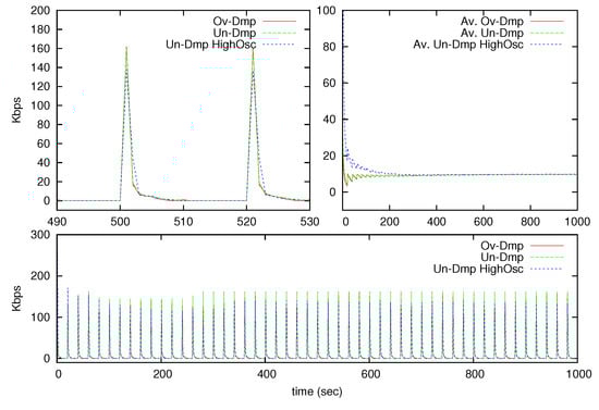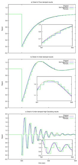 The first signal is an over-damped step-response, the second one is an under-damped step-response and the last one is also an under-damped step response but with a high-oscillating behaviour. The nature of the signals may have an important effect on the results, reflected not only by the variable but in the number of sent messages () in the time-window. For example, for a signal that changes rapidly during a short period but remains constant during a long period, the proposed SoD sampling should perform significantly better than the periodic one; on the contrary, for a signal that changes during the whole operation time, the proposed SoD sampling should perform worse than before, but, in any case, based on Proposition 1, it has to perform better than the periodic one if the delta value δ is well selected to match the desired throughput.