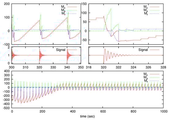 The algorithm behavior is shown in Figure 4 and Figure 5 using the under-damped High-Oscillating test signal, which was the worst case. Figure 4 shows the results from Procedure 1 to calculate , where variables and are also drawn. As seen, converges to 0 for long-time operation. Figure 5 shows the , and variables. Similar results are achieved for the over-damped and under-damped signals.