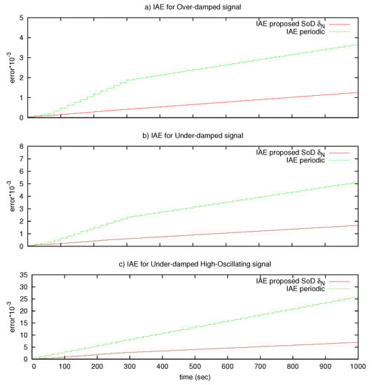 In addition, the Integral Absolute Error () is measured and presented in Figure 7. This figure shows that the error measured using the SoD algorithm is much smaller than the conformant periodic transmission strategy in long-time simulation intervals for the three tested signals.