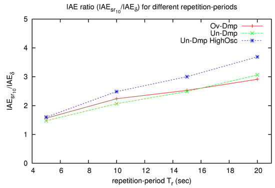 IAE ratio () between the conformant periodic sampling and the SoD sampling for different repetition periods.