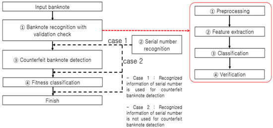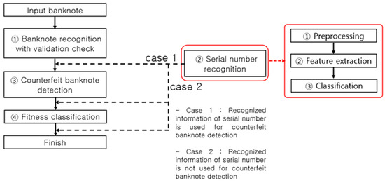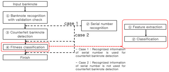 Figure 4 presents a typical process flow of banknote recognition implemented in a self-service terminal. An input banknote is scanned by a sensor to discern the image and other data necessary for recognizing its denomination and anti-counterfeiting features. The first step in the process of banknote recognition is identifying the denomination of an input banknote, thereby clustering all classes into a single class, and implementing a size-based ① validation check, followed by ① banknote recognition on the class of notes identified as banknotes, ③ counterfeit banknote detection using anti-counterfeiting data specific to each recognized denomination, and ④ fitness classification. The flow direction of ② serial number recognition is determined depending on the counterfeit banknote detection method as shown in Figure 4. System efficiency is the main reason for setting the process flow direction as ① validation check and banknote recognition, then ③ counterfeit banknote detection, and finally ④ fitness classification. For example, any input materials other than banknotes to be classified, such as common paper and newspaper, are sorted out at the ① validation check step, obviating the later steps of ③ counterfeit banknote detection, ② serial number recognition, and ④ fitness classification. On the other hand, an input counterfeit banknote similar to the classified banknote [7] may pass through the banknote recognition step, but will likely be detected as counterfeit in the counterfeit banknote detection step implemented using anti-counterfeiting features specific to the denomination classified, which makes the steps of serial number recognition (case 2 in Figure 4) and fitness classification superfluous.