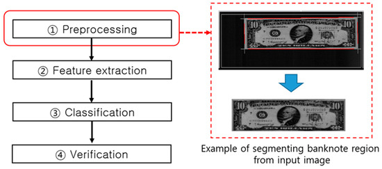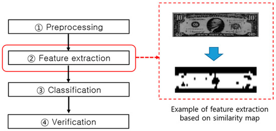 Most conventional sensors for banknote recognition are visible-light line sensors, such as contact image sensors (CIS) [8,9,10,11,12,13]. Such sensors mostly obtain color or black-and-white images and are used for the typical process flow of ① preprocessing, ② feature extraction, ③ classification, and ④ verification, as shown in Figure 5. Using a color image sensor is more advantageous because it provides more information than a black-and-white sensor [14], but its production cost is higher. Besides image resolution, national currencies and classification criteria are factors influencing the efficiency of banknote recognition.