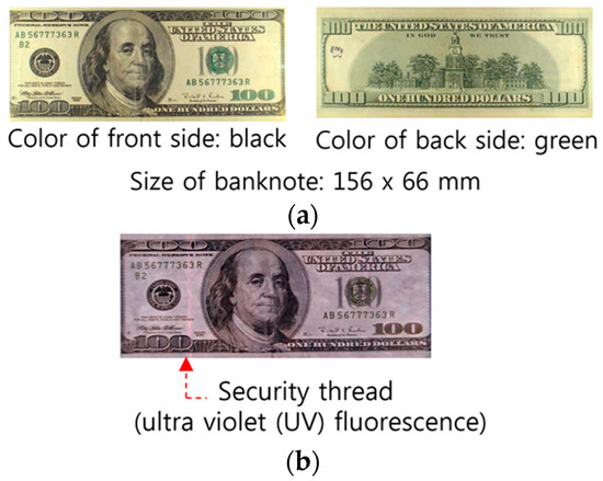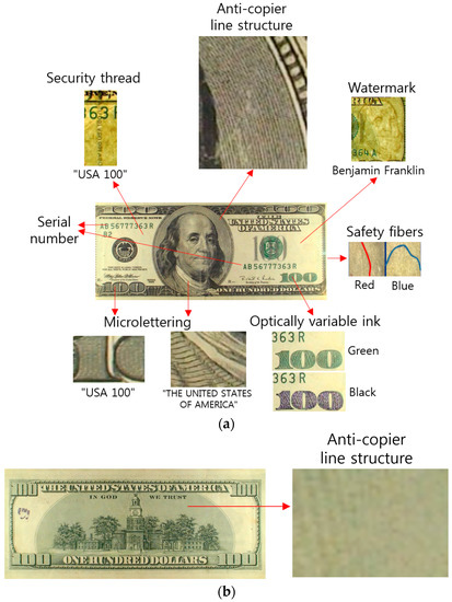Figure 12 shows other anti-counterfeiting features on the obverse and reverse sides of a genuine USD 100 bill: a security thread, anti-copier line structure (fine line printing), a watermark, safety fibers, optically variable ink, microlettering (microprinting), and serial numbers. The optically variable ink appears to change color depending on the viewing angle. Microlettering (microprinting) refers to microfine printed letters of specific words, such as “USA 100” and “THE UNITED STATES OF AMERICA” in the corresponding parts (Figure 12a). These anti-counterfeiting features are used in the detection of counterfeit banknotes [76,77,78,79].
