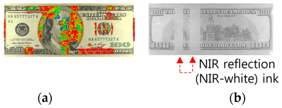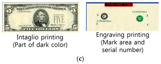 Figure 11 highlights the anti-counterfeiting features of a genuine USD 100 bill: the magnetic factor (obverse), two anti-counterfeiting lines responding to IR reflection, and intaglio and engraving technologies (reverse). As illustrated in Figure 11a,b, the magnetic factor and NIR factor contained in a genuine banknote, which are not visible under visible light, are perceived by a magnetic sensor and NIR sensor, respectively. Therefore, counterfeit banknotes without such magnetic and NIR factors can be easily detected by the aforementioned sensors. Figure 11c illustrates the printing technologies used in a genuine USD banknote: the dark-colored parts undergo intaglio printing and the mark or serial number undergo engraving printing. If a counterfeiter applies intaglio or engraving printing to the entire banknote, it can be detected as a counterfeit banknote due to a printing state different from a genuine banknote [76].