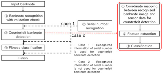 Most of the counterfeit banknote detection methods presented in previous studies corresponding to step ③ in Figure 13 (left), are carried out based on denomination and banknote input information (input side, deflection, inclination, etc.) after the banknote recognition step. As mentioned above, the process flow of counterfeit banknote detection bifurcates into the use and non-use of the serial number (Figure 13 case 1 and case 2, respectively).