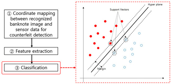 In Figure 13, ③ counterfeit banknote detection in the overall process flow (left) follows the subprocess steps of ① coordinate mapping between the recognized banknote image and sensor data for counterfeit detection, ② feature extraction in which ROIs are selected from the recognized banknote image for anti-counterfeit feature extraction and sensor data are extracted for counterfeit detection based on the related coordinate information, and ③ classification through which counterfeit banknotes identified using the detection features are thus extracted.