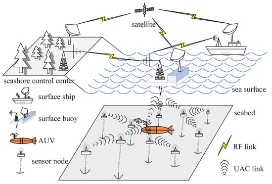 One valuable application of IoT is utilizing three-dimension underwater acoustic sensor networks (3D UASNs) to perform marine environmental monitoring for the exploitation, utilization, and protection of marine resources []. Figure 1 shows a typical scenario of the 3D UASN application. Numerous sensor nodes are anchored at various depths in the ocean by buoys or cables, allowing information acquisition of the underwater surroundings. An autonomous underwater vehicle (AUV) is employed to assist information transmission. The monitoring information is finally delivered to the seashore control center via acoustic links and radio frequency (RF) links.