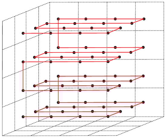 After dividing the entire 3D network into several grids, the AUV executes a traveling path to collect data from the whole network. Five kinds of paths have been described, called Layered-Curve, Triple-Curve, Layered-Scan, Triple-Scan, and 3D-Hilbert that can fill a given cubic area. In [], Cui et al. compared these five paths with difference parameters. The simulation results showed that, in these five kinds of proposed paths, Layered-Scan and 3D Hilbert showed the best performance in term of path length. Because here we only need to consider path length, we selected the Layered-Scan as the trajectory of the AUV in this paper. Dividing the 3D region into several layers along one axis, each layer is regarded as a 2D plane, which results in Layered-Scan paths as shown in Figure 4.