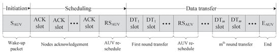 In this phase, the AUV travels along the specified path and moves around the specified locations to collect data from nodes within each probabilistic neighborhood. The residence time varies with the number of nodes within each probabilistic neighborhood and the value of transmission rounds adaptively. Then, a TDMA-based multiple access control protocol as shown in Figure 5 is utilized. The protocol mainly contains three phase illustrated as follow: