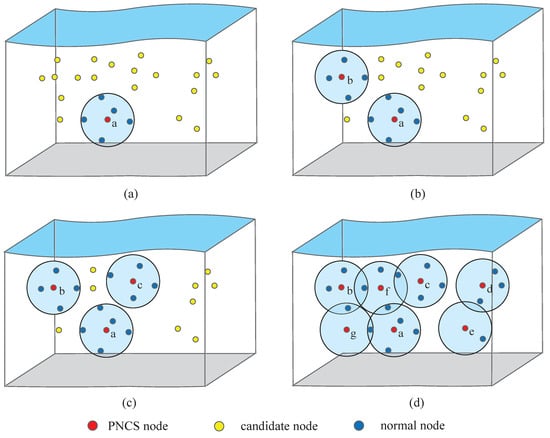 An example of PNCS construction (a) The first PNCS node selection; (b) The second PNCS node selection; (c) The third PNCS node selection; (d) The final PNCS construction.