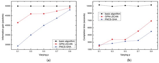 (a) Average information gain VS p; (b) Average completion time VS p.