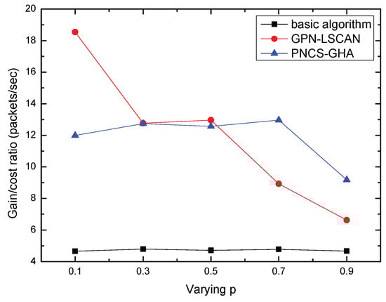 Figure 8 shows the gain to cost ratio of our proposed algorithms. Both our GPN-LSCAN and PNCS-GHA perform much better than the basic algorithm. We also note that with a lower required probability, GPN-LSCAN showed a higher gain to cost ratio than PNCS-GHA, but at a high p, the gain to cost ratio of GPN-LSCAN was lower than that of PNCS-GHA. This is because when the neighborhood size is large enough, the path length of GPN-LSCAN approaches that of the PNCS-GHA. When the grid size is small, the path length is significantly longer.