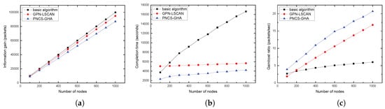 (2) The effects of the number of nodes n: In this part, the parameter p was set to be 0.7. Figure 9a shows the variation of the average information gain for different n arguments in the GPN-LSCAN, PNCS-GHA, and basic algorithm. In both the GPN-LSCAN and PNCS-GHA models, the average information gain significantly increased as n increased. Figure 9b validates the advantages of our proposed algorithm in average data collection completion time. Since the AUVs in GPN-LSCAN and PNCS-GHA do not need to visit every node in the 3D UASN, the average data collection completion time in our proposed algorithms are obviously shorter than that of the basic greedy algorithm. Additionally, we also find that when n increased, the average data collection completion time in our proposed algorithms increased more slowly than what occurs when using the basic algorithm without neighborhood. This trend is interpreted below. Obviously, increases in n typically cause longer paths for the AUV. However, as the path length of the GPN-LSCAN model is influenced by the size of network and neighborhood, and the path length of the PNCS-GHA is influenced by a combined impact of neighborhood size and nodes number, the increased number of nodes has less impact on the path costs of our proposed algorithms than on the basic algorithm without any neighborhoods. Accordingly, the costs of our two algorithms become much lower than the cost of the basic algorithm as n increases. In Figure 9c, we note that, when the n increases, the gain to cost ratio in our proposed algorithms becomes enormously higher than that of the basic algorithm without any probabilistic neighborhoods.