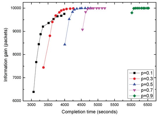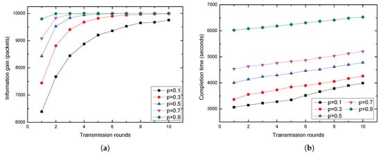 Figure 10 shows the average information gain and the average data collection completion time for variable parameter p with different transmission rounds. With increased transmission rounds, the average information gain as shown in Figure 10a gradually approaches saturation and the average data collection completion time in Figure 10b increased steadily. In addition, the information gain and data collection completion time increased with the increase of p.