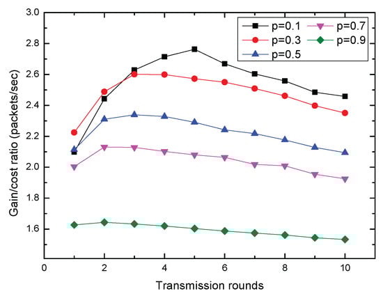 In Figure 11, we show the gain to cost ratio for different p values with variable transmission rounds. It can be seen that with increased transmission rounds, the gain to cost ratio decreased after increasing initially. For different values of parameter p, the gain to cost ratio reached the maximum on individual transmission rounds. When the transmissionrounds = 5 and p = 0.1, the gain to cost ratio reached a global maximum. It is important to point out that the gain to cost ratio reached the maximum on distinct transmission rounds due to the communication parameter setting.