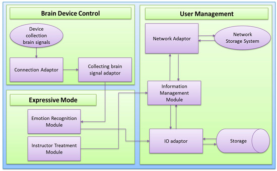 We would like to explain the technology, which is used in the proposed system. Figure 2, shows the data flow of the proposed system. The diagram flow starts from EEG brain device through a Bluetooth connection adaptor (BAC). The connection adaptor provides a connection to the brain signal adaptor (BSA) and it goes directly to the emotion recognition module (ERM). This component includes the emotion detection and other modules which will be discussed in further sections. This component can forward data to the storage devices (SD), network storage system (NSS) and information management module (IMM) through IO adaptor (IOA). IMM is also connected to instructor treatment module (ITM) for retrieval and updates of treatment procedures.