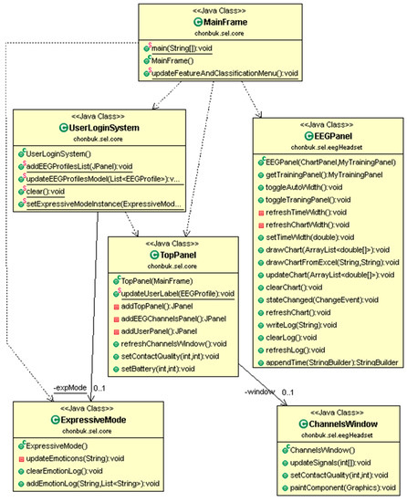 Figure 4 presents the class diagram of our development of graphical user interfaces. It contains the main interface in MainFrame which is a top level interface of our system. UserLoginSystem class has a user login functionality with existing users’ profiles. EEGPanel is part of the ‘eegheadset’ package which corresponds to real time EEG data visualization. TopPanel is a top panel of CAES, where we can see the EEG channel’s connectivity status, logo, and user information. ExpressiveMode class is responsible of emotion recognition module of our system with collaboration of other classes such as classes from WEKA.