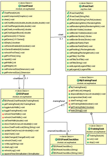 The following class diagram in Figure 5 is about the functionality of ‘eegheadset’ which is responsible for EEG data acquisition and real-time EEG visualization. EEGPanel is the top level class of this package which contains the ChartPanel, MyTrainingPanel, and EEGPanelCheckBox. JFreeChart is an external class from an open source chart visualization project and it is embedded through the ChartPanel. TrainingTask is a multithreaded inner class of MyTrainingPanel which has user training session functionality for recording an EEG data for training purposes.