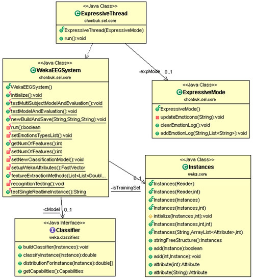 A more specific class diagram of emotion recognition using the WEKA interface Classifier is presented in Figure 6. WekaEEGSystem is a top level class is running under ExpressiveThread in its own separate thread instance. The Instances class from WEKA has been used for creating training and testing datasets. Later, these datasets were used by WekaEEGSystem through Classifier. Moreover, ExpressiveThread uses and is dependent on functionality, by instance of ExpressiveMode.