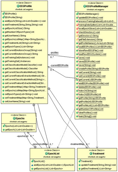 Finally, we present the class diagram for the user profiling system in Figure 7. EEGProfileManager has a lot of facilities to manage the EEG user profile instances. EEGProfile corresponds to each single user profile which contains the user EEG data in the form of training epochs, user naming information, and treatment plans, if any treatment is inserted by any instructor. Treatment and EpochList are inner classes of EEGProfile and Epochs class is an inner class of EpochList. Epochs represent a single EEG signal epoch and is stored in the Epochlist List data structure. There are get methods in all classes which are used to retrieve the stored information of the corresponding user profile.