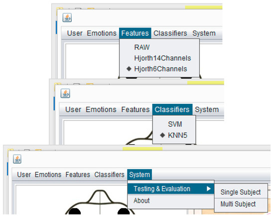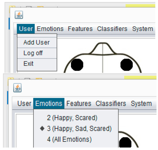 CAES (menu details) shows the menu options of the proposed system. A user can select any option from the above menu and he/she will see the results according to his/her menu-option selection. Different kinds of functions are accessible through the above menu options depending on the user requirements; for example, if the instructor is only interested in two emotions (happy, scared) he needs to choose the first option in the emotions menu, and similarly users have different features and classification options.