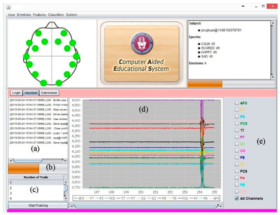 CAES (headset setup); this is also known as the device control module: (a) this component shows the device-related events and records into the database; (b) is the training progress bar; (c) the training component that allows the instructor to record the emotion training of the current subject; this module computes and updates the classification model after each training session; (d) this component shows the signal activity of each electrode of the brain device; (e) this component helps the user select his/her desired brain electrode.