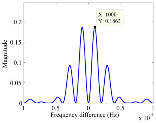 In Equation (11), and will determine the position of the peak in the frequency bins. will monotonically decrease to zero in , in other words, the peak decreases as the frequency error increases in the range Hz. However, when is equal to zero, is equal to zero too. That is to say, the peak is no longer consistent with the right Doppler bins. When is equal to , i.e., the frequency difference is equal to Hz, a maximum of will be achieved and will reach its maximum, which will bring in a large frequency error. The curve of is illustrated in Figure 2.