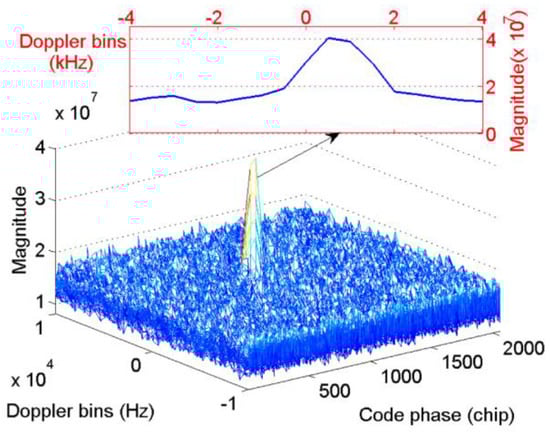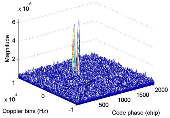 The basic concept of signal acquisition is to obtain available satellite PRN numbers, estimated Doppler shifts, and code phases through correlation between signal of Equation (3) and the local duplicates, then a random variable is produced, where, and stands for different carrier frequencies and delays to be tested. When the GPS L1 signal is present [26]: