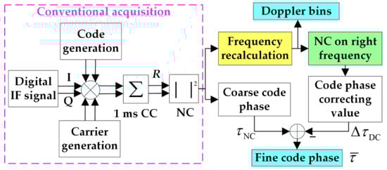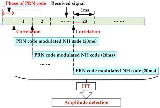 Considering that the frequency of conventional acquisition algorithms deviates from the desired value because of the secondary codes, a more accurate frequency must be obtained. Generally, the frequency spectrum of a digital sine wave can be obtained via discrete Fourier transform, and the revolution of the spectrum is proportional to the ratio of the sampling frequency and the samples. To apply the theory to GNSS signal acquisition, the PRN codes, NH codes, and navigation bits must be demodulated from the received signal to obtain the spectrum of the carrier. The code phase estimated from conventional acquisition algorithms can be used to remove the PRN code. Thus, there remains the NH codes and navigation bits.