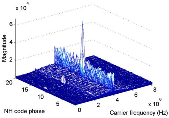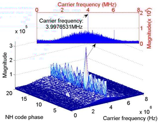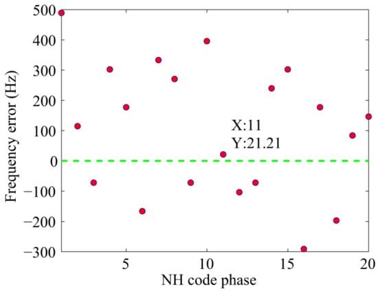 Figure 5 and Figure 6 present the results of the new scheme of the same signal used in Figure 3. These parameters will not repeat here. In Figure 5, the length of the FFT is 524,288 samples, That is, the revolution of the spectrum is Hz. Figure 5 shows that the index of the maximum value is 11, which is consistent with the default value. Meanwhile, in the carrier frequency dimension, the peak appears at 4,095,018 Hz, which represents a slight error of 18 Hz. Figure 6 shows the frequency error against different NH code phases in a more direct way. Only when the local NH codes is aligned with the received signal can the peak reach the maximum value. In other cases, the frequency error of tens to hundreds of hertz occurs.