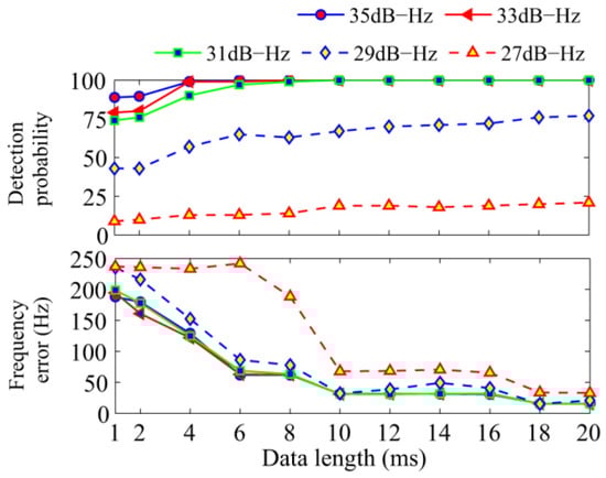 The first simulation tests the effect of signal lengths on the proposed algorithm. The total integration time was set to 100 ms, and different C/N0s were tested. The detection probability and average frequency error are shown in Figure 8. With the increase of the length of FFT, the detection probability increases as well, while the frequency error decreases. It is clear that, with the increase of C/N0, the performance improves greatly. When the C/N0 is greater than 31 dB-Hz and the data length is greater than 8 ms, the performance differs slightly only in the error of the frequency. However, different data lengths show a large difference in the frequency error. In high C/N0 conditions, the FFT of 10ms length or shorter is enough for the tracking process. Considering the conditions in the following analysis, 20 ms-length FFT is used for better performance if there is no special notation.