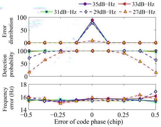 The second simulation analyzes the reliability of the proposed algorithm against the accuracy of the coarse code phase. The total integration time was set to 100 ms. The error of code phase obtained from the conventional NC algorithm was set to [−0.5, +0.5] PRN code chips, which are equivalent to [−4, +4] samples. The results are shown in Figure 9. The top panel shows the distribution of the code phase error of successful NC acquisition, and the code phase error have been rounded up and down to an integral sample. It is clear that the error of the code phase distributes mainly within one sample. The middle and bottom panels show the detection probability and frequency error of the proposed algorithm, respectively. When the error of code phase is less than or equal to 0.125 chips, there is no loss of detection probability. When the code phase error increases further, the detection probability decreases. While the frequency error of the proposed algorithm remains stable.