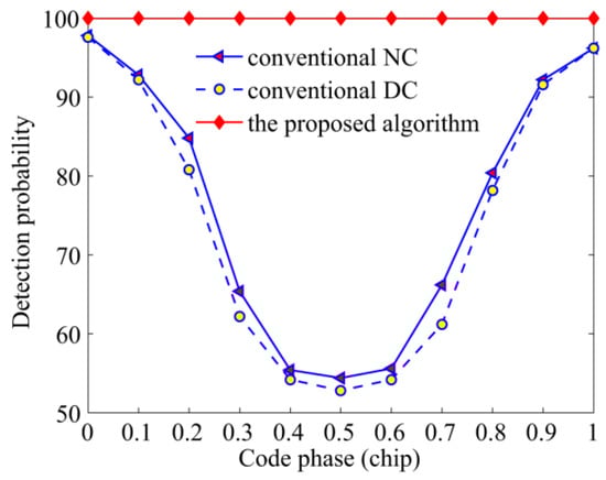 Detection probabilities of the NC, DC, and the proposed algorithms against the code phase.