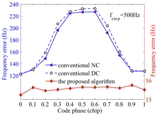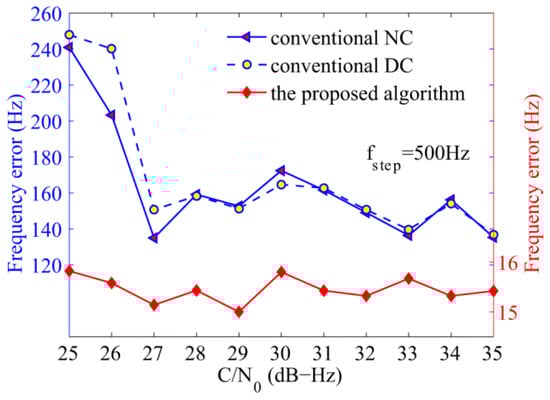 The fourth simulation verifies the acquisition performance against C/N0 ranging from 25 dB-Hz to 35 dB-Hz, the total integration time was set to 100 ms. It is clear that the proposed algorithm demonstrates considerable advantage in Figure 12. When the C/N0 is 30.3 dB-Hz, the proposed algorithm can achieve a probability of 90%, which is 22% higher than that of the NC algorithm, and 6.5% more than the DC algorithm. As is known, when the GPS L1 signal is present, the bit transition loss of the DC algorithm can be negligible when long integration time is experienced, and the acquisition probability is higher than that of the NC algorithm. However, Figure 12 shows that the NC algorithm exhibits a slightly better performance than the DC algorithm although it has to endure squared losses, it is consistent with the analysis that frequent bit transitions of NH codes can deteriorate the acquisition performance, especially of algorithms that are affected by the polarity of the variable. Note that the DC algorithm is not affected directly by the signal polarity, but the product of two adjacent units. Considering the polarity of the secondary codes, bit transitions can decrease the performance of the DC algorithm, too. The analysis also applies to the results of the frequency in Figure 13. Moreover, it is shown that the detection probabilities of the NC and DC algorithms increase slowly when the C/N0 is higher than 32 dB-Hz, because the performance is mainly affected by frequent bit transitions in this case. Large frequency errors caused by bit transitions are the main reason, while C/N0 is only the secondary cause.