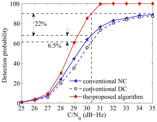 Detection probabilities of the NC, DC, and the proposed algorithms against C/N0.