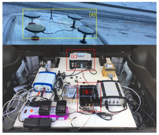 GNSS comprehensive test platform, (a) stand for GNSS antennas, (b) is the intermediate frequency signal sampler, and (c) is ProPak6 receiver.